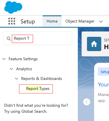 To select the default Columns fields, go to Setup, and in the Quick Find box search for ‘Report Types’ then select.