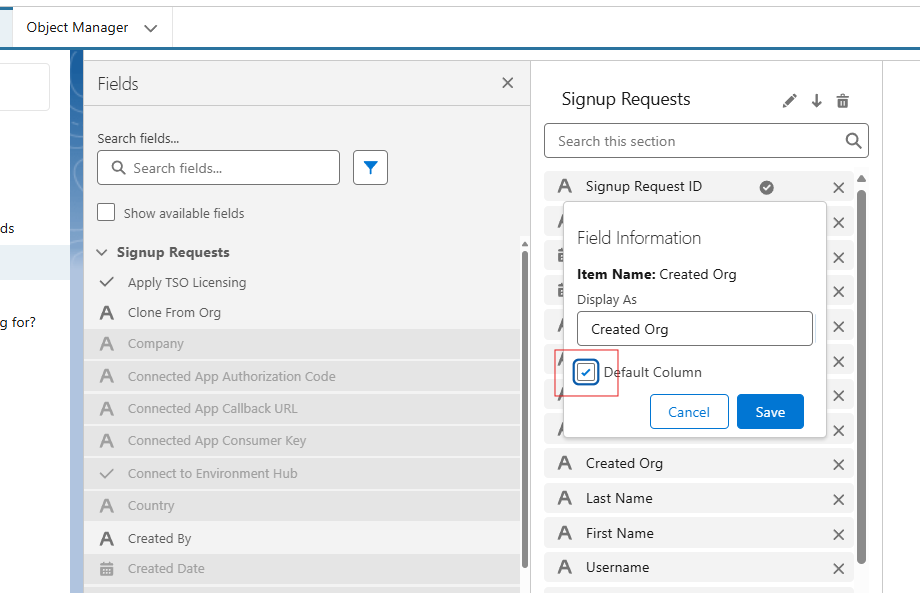 Then, in the selected fields section, click the pencil icon next to the field you want to make Default. In the small window that pops up, check the Default Column box.